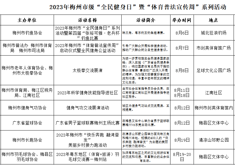 同时,全市各地还将陆续举办各项体育赛事,掀起全民参与、科学健身的浪潮。其中,梅州市钓鱼协会6日在梅江区城北狂浪钓场举办钓鱼比赛;梅州市老年人体育协会和梅州市太极拳协会8日在足球文化公园广场举行太极拳交流展演;梅州市体育局、梅江区税务局和江南社区将于11日、18日在江南社区开展2023年科学健身技能指导进社区活动;梅州市健身气功协会12日在市剑英体育馆举办健身气功交流展演活动;广东省男子篮球联赛梅州VS东莞主场比赛12日在梅县区文体中心举行等。