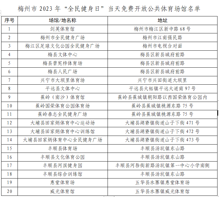 记者了解到,今年“全民健身日”前后,我市精心为市民送上一系列体育健身福利。8日,剑英体育馆、梅州市全民健身广场、梅江区足球文化公园全民健身广场、梅县文体中心、梅县曾宪梓体育场、梅县人民广场、兴宁市大坝里体育场、平远县文体中心、蕉岭(南沙)体育馆、蕉岭国荣体育公园体育场、蕉岭泰志全民健身广场、大埔县田家炳体育中心运动场、大埔县田家炳体育中心训练馆、大埔县田家炳体育中心全民健身广场、丰顺县体育场、丰顺县文化体育公园、丰顺县河滨健身园、丰顺县综合训练馆、惠堂体育场和威光体育馆共20个公共体育场馆免费向公众开放。