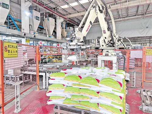 梅州双胞胎饲料有限公司生产车间,机器轰鸣声此起彼伏,多条自动化生产线正满负荷运转。(王锐 摄)