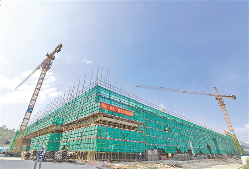 丰顺县经济开发区标准化厂房及配套基础设施项目建设现场,塔吊林立、机器轰鸣,施工人员正紧张作业。(王锐 摄)