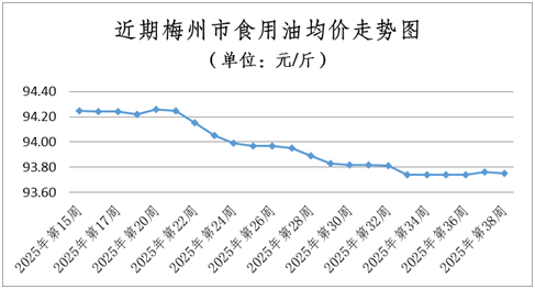 粮油价格基本稳定。本周粮食均价为3.22元/斤,环比(与2025年第37周相比,下同)持平;食用油均价为93.75元/桶(5L),环比下降0.01%。