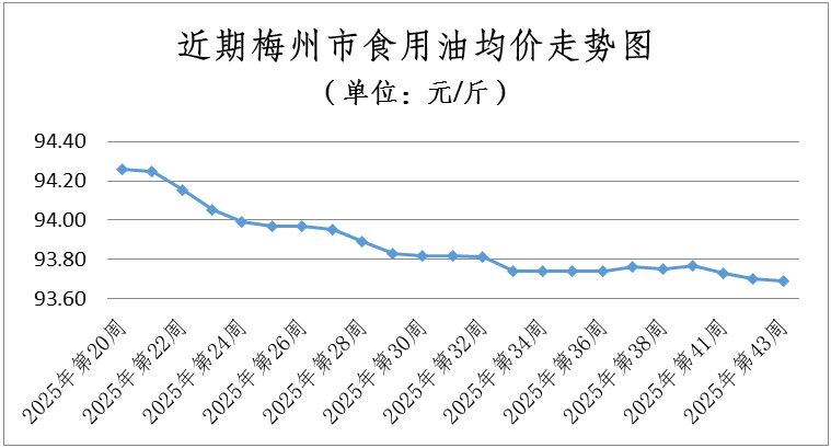 粮油价格基本稳定。本周粮食均价为3.22元/斤,环比(与2025年第42周相比,下同)持平;食用油均价为93.69元/桶(5L),环比微降0.01%。