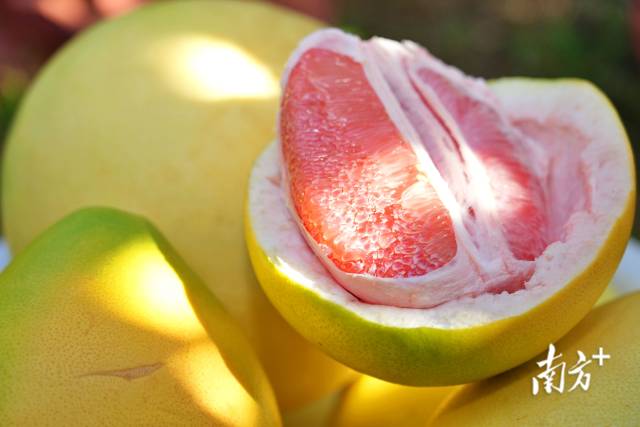 在大埔高峰农业发展有限公司的种植基地,果农们正穿梭林间,采摘成熟的蜜柚。一颗颗饱满的蜜柚被装入吊运袋,金黄的果皮在阳光下泛着光泽。轻轻剥开,晶莹剔透的果肉呼之欲出,咬上一口,清甜汁水瞬间溢满唇齿。