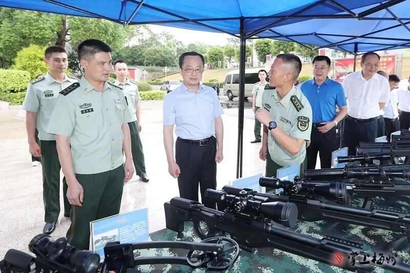 陈敏率“八一”拥军慰问团看望慰问武警梅州支队官兵,在营区观摩武器装备。