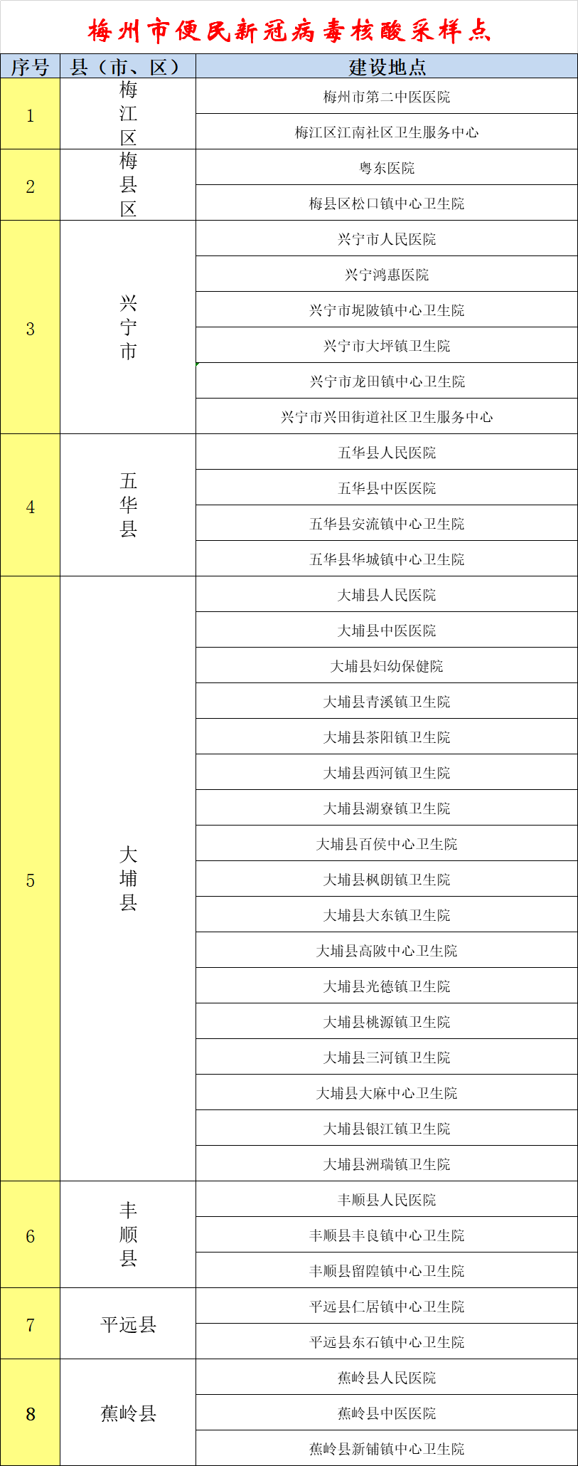 当前,我市新冠肺炎疫情防控态势持续向好,已进入疫情防控常态化阶段,而国外疫情仍持续蔓延,存在境外输入、境内反弹的风险,为推进全市常态化疫情防控工作,落实常态化防控措施,保障经济社会秩序全面恢复,现就有关事项通告如下:一、认真做好个人防护。请市民群众增强自我防护意识,养成勤洗手、多运动、用公筷等良好个人生活习惯,食物煮熟煮透,不接触和食用野生动物,咳嗽、打喷嚏时注意遮挡,室内常通风,保持1米以上的社交距离,减少非必要的聚集性活动。进入封闭场所,以及“两站一场”等场所要主动配合测体温、扫粤康码,随身携带口罩,与他人小于1米距离接触时佩戴口罩。医疗机构工作人员,在密闭公共场所工作的营业员、保安员、保洁员、司乘人员、客运场站服务人员、警察等人员以及就医人员要佩戴口罩。出现身体发热等不适时,佩戴口罩前往正规医院发热门诊就诊,如实告知医生近14天内旅居史,与可疑发热咳嗽患者、疫情高发地区和入境人士接触暴露史。需要检测新冠病毒的市民,可在全市39个便民新冠病毒核酸检测采样点(详见附件)进行采样检测,费用自理。二、营造清洁卫生环境。市民群众、各有关单位要深入开展爱国卫生运动,清除卫生死角,保持各类公共场所和家庭环境卫生,科学做好公共场所、公共设施、公共交通工具、小区楼道电梯和封闭场所等区域的通风消毒。三、配合健康服务管理。请外来人员抵梅当天主动如实申报粤康码。各县(市、区)和市有关部门可根据疫情防控需要,采取体温检测、粤康码查验等措施,抵梅人员应当积极配合。一旦发现聚集性疫情,立即拨打应急处置小组热线电话110,处置小组可划定一定范围的重点防控区域和重点防控人群,有关场所和人员应按规定配合做好流行病学调查、核酸检测、隔离医学观察等健康服务管理措施。四、严防境外输入疫情。全面落实我省境外疫情输入防控措施,强化社区排查,对在入境口岸所在地隔离期满的抵梅人员,纳入社区健康管理。五、落实社区管理措施。各县(市、区)要落实外来人员粤康码查验、登记管理等防控措施。在落实防控措施的基础上,社区内各项服务设施、服务站点、生活场所和公共场所全面开放。出现疫情的社区严格做好密切接触者排查和隔离管理,做好终末消毒,必要时采取限制人员聚集性活动、封闭式管理等措施。六、有序恢复正常秩序。在落实防控措施前提下,全面开放商场、写字楼、超市、宾馆、餐馆、农贸市场等工作生活场所;采取预约、限流等方式,开放公园、旅游景点、运动场所,以及图书馆、博物馆、美术馆等室内场馆;可举办各类必要的会议、会展活动等。按照省、市有关部门的通知和相关技术指南,在确保防控措施落实到位的前提下,逐步稳妥开放密闭式娱乐休闲场所。上述场所要严格落实测体温、扫粤康码等措施。七、逐步全面返校复学。全市中小学校、大中专院校有序复课,分期分批安排学生返校复学。疫情重点国家和地区返梅师生员工,实施集中或居家隔离医学观察14天并核酸检测阴性后,经学校批准方可返校。落实学校防控主体责任,学校应掌握师生员工每日健康状况和返校前14天的动向,做好师生员工健康监测,规范学生发热症状预警处置,及时甄别处置常见传染病。做好室内外环境卫生,加强师生聚集场所和公共区域的通风、清洁、消毒,落实各项食品安全管理措施。八、落实单位防控责任。企事业用人单位履行主体责任,优化日常防控管理,做好公共区域通风、清洁、消毒,完善应急处置预案。建立员工健康申报和体温监测制度,落实人员出入登记管理,控制会议频次和规模,尽量使用视频、电话会议等方式,采取分区作业、分散错峰就餐等措施,尽量减少人员聚集。梅州市新型冠状病毒肺炎