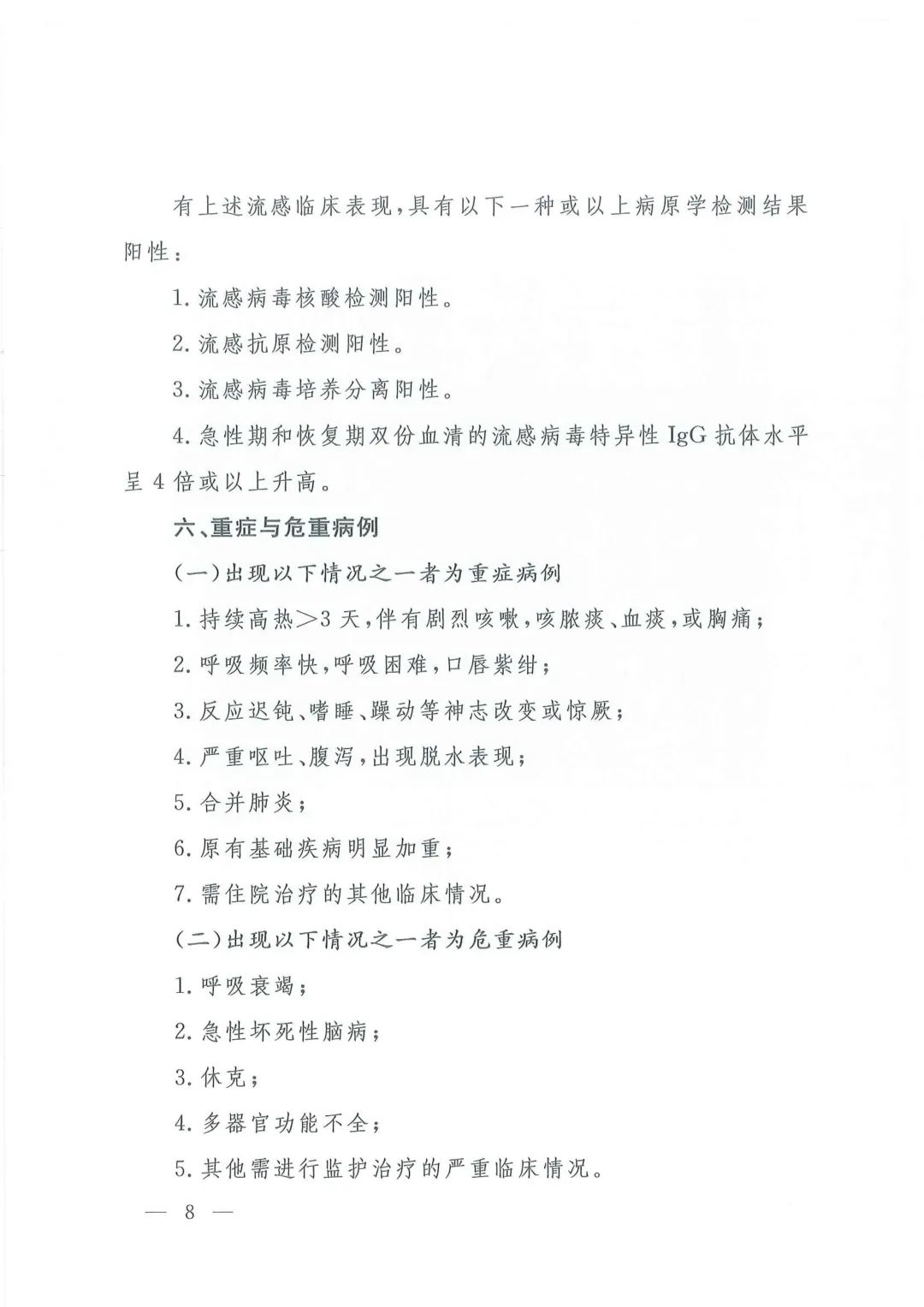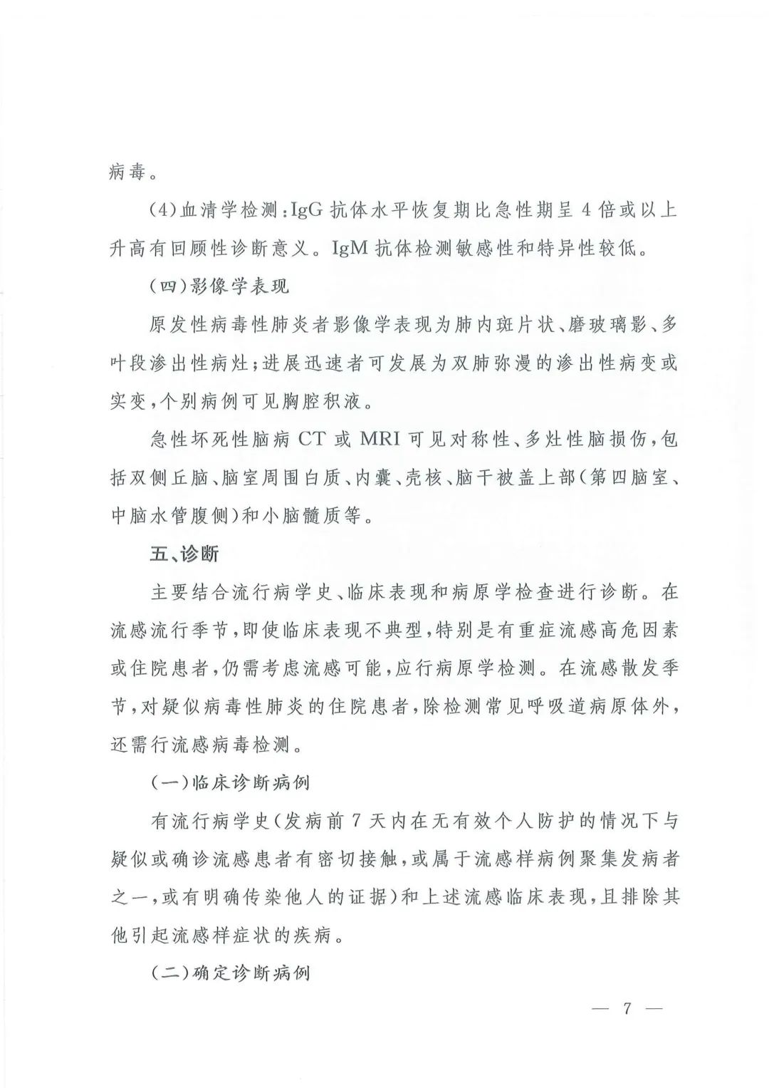 此版诊疗方案主要对以下内容进行了修订完善:进一步完善了儿童流感临床表现、并发症等相关内容,增加了流感与“新冠肺炎”的鉴别诊断,进一步规范了流感抗病毒药物使用方法,对轻症流感中医辨证治疗予以进一步完善。