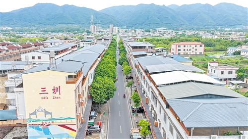 “我们遵循‘节点出彩、串点成线’理念,以晋元大道沿线及其周边典型村为核心,持续深化九岭村至圩镇片区建设。外立面改造采用黑白灰主调,优选本地绿色建材,铁皮瓦整治换用铝镁锰瓦,加装特色格栅彰显‘鱼米之乡’韵味,同步推进圩镇店招规范化改造、绘制本土主题彩绘。”三圳镇党委委员、副镇长陈志雄说。