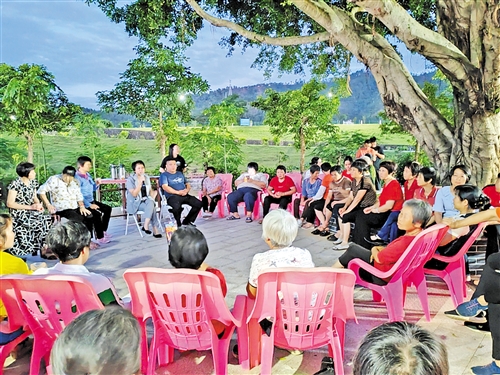 在三河镇,镇村干部和村民围坐在榕树下,以“拉家常”的方式畅谈村里的大小事务。(三河镇政府供图)